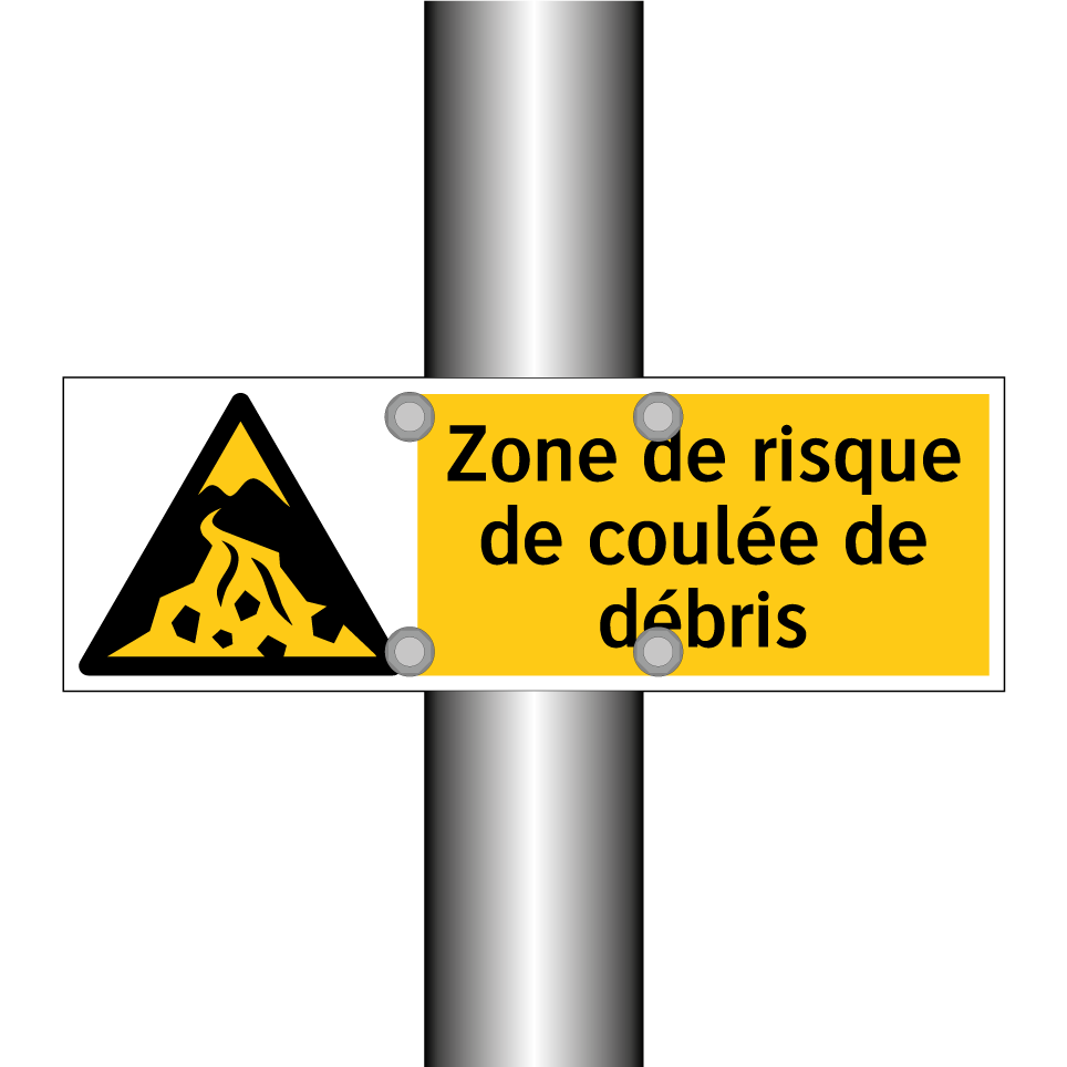 Panneau d'avertissement avec le texte : "Zone de risque de coulée de débris"
