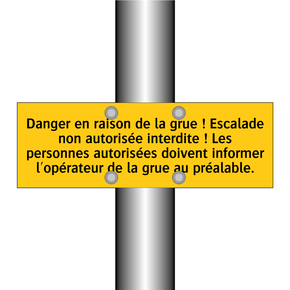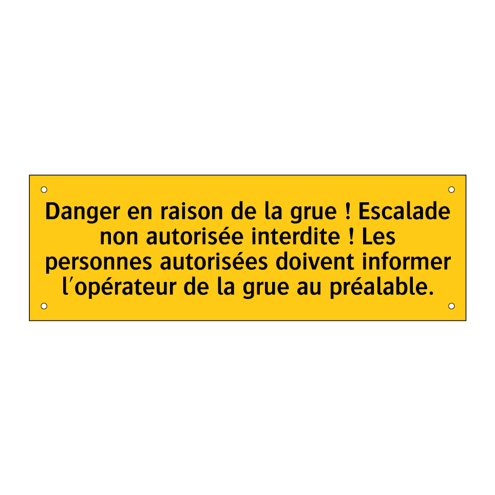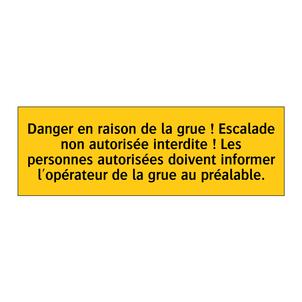 Panneau d'avertissement avec le texte : "Danger en raison de la grue ! Escalade non autorisée interdite ! Les personnes autorisées doivent informer l'opérateur de la grue au préalable"