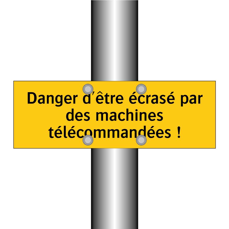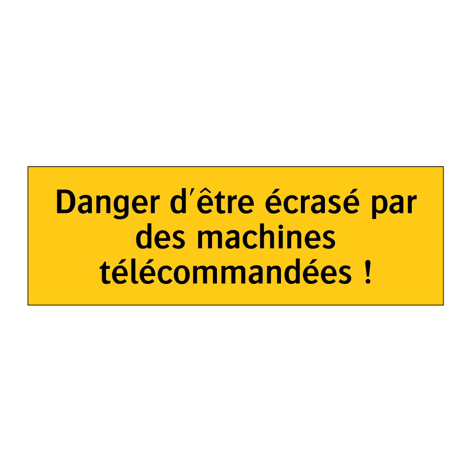 Panneau d'avertissement avec le texte : "Danger d'être écrasé par des machines télécommandées !"