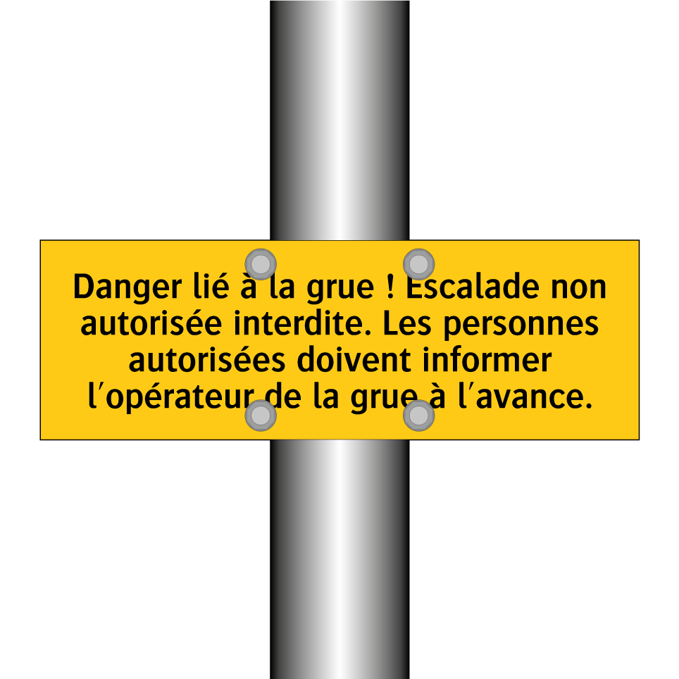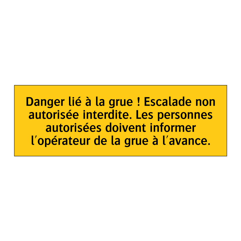 Panneau d'avertissement avec le texte : "Danger lié à la grue ! Escalade non autorisée interdite. Les personnes autorisées doivent informer l'opérateur de la grue à l'avance"