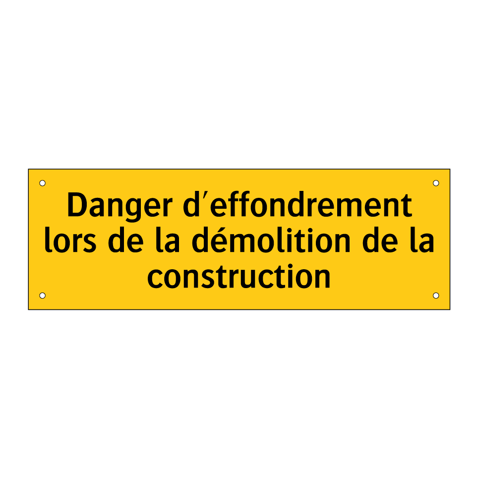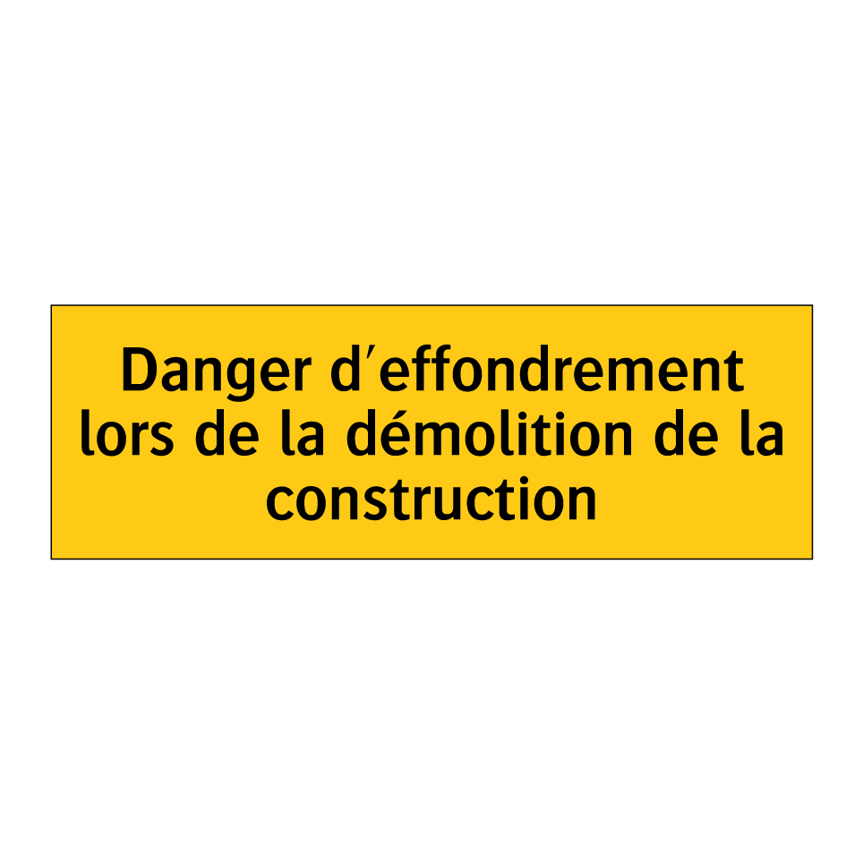 Panneau d'avertissement avec le texte : "Danger d'effondrement lors de la démolition de la construction"