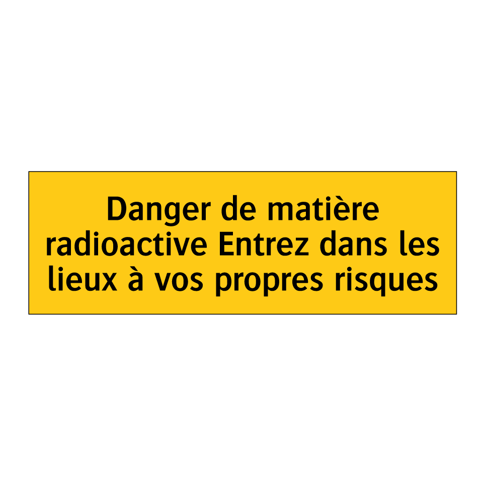 Panneau d'avertissement avec le texte : "Danger de matière radioactive Entrez dans les lieux à vos propres risques"