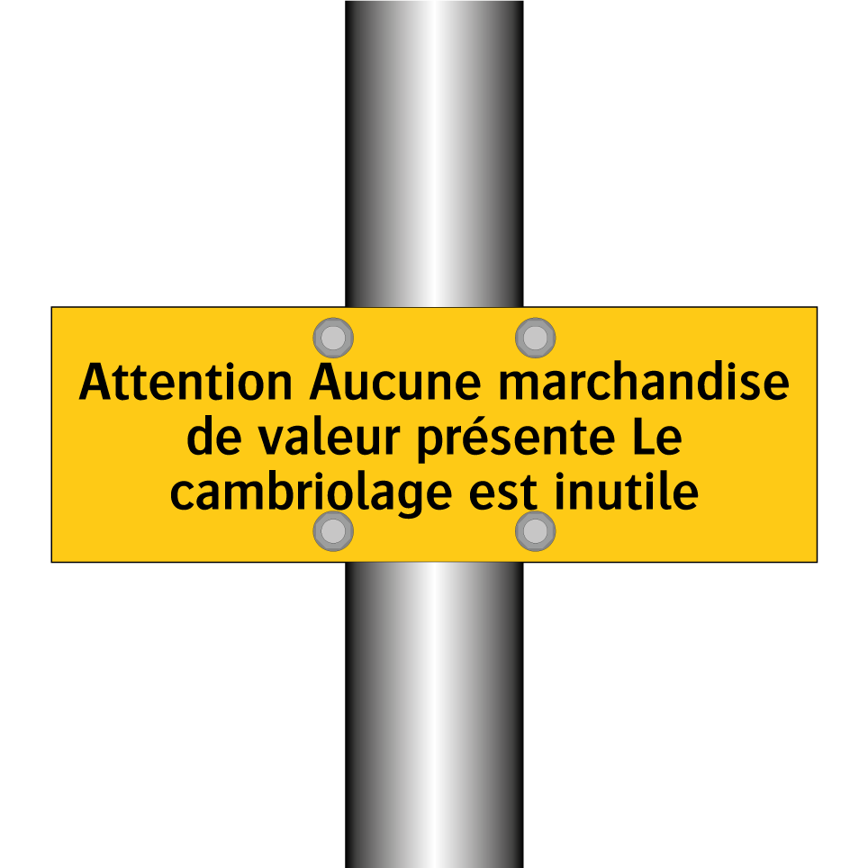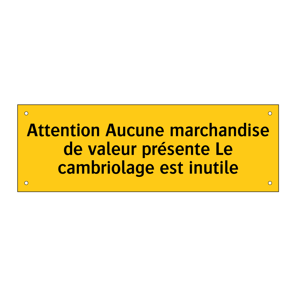 Panneau d'avertissement avec le texte : "Attention Aucune marchandise de valeur présente Le cambriolage est inutile"