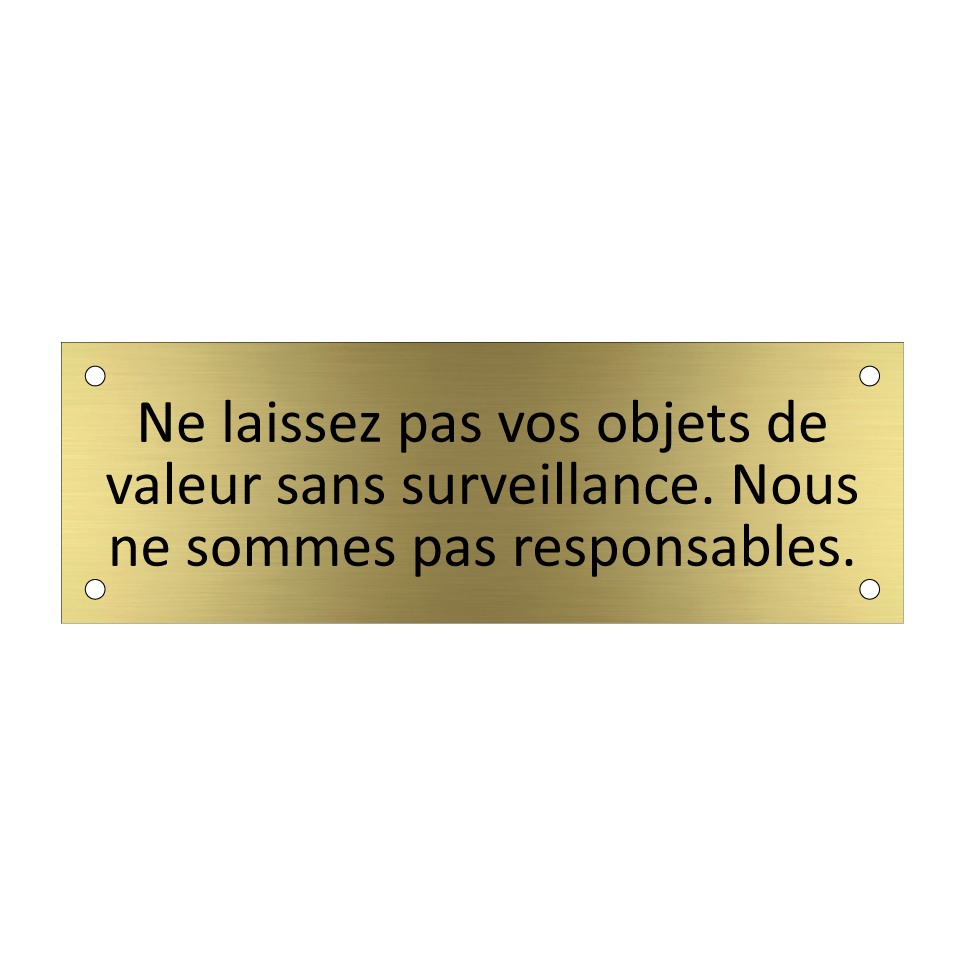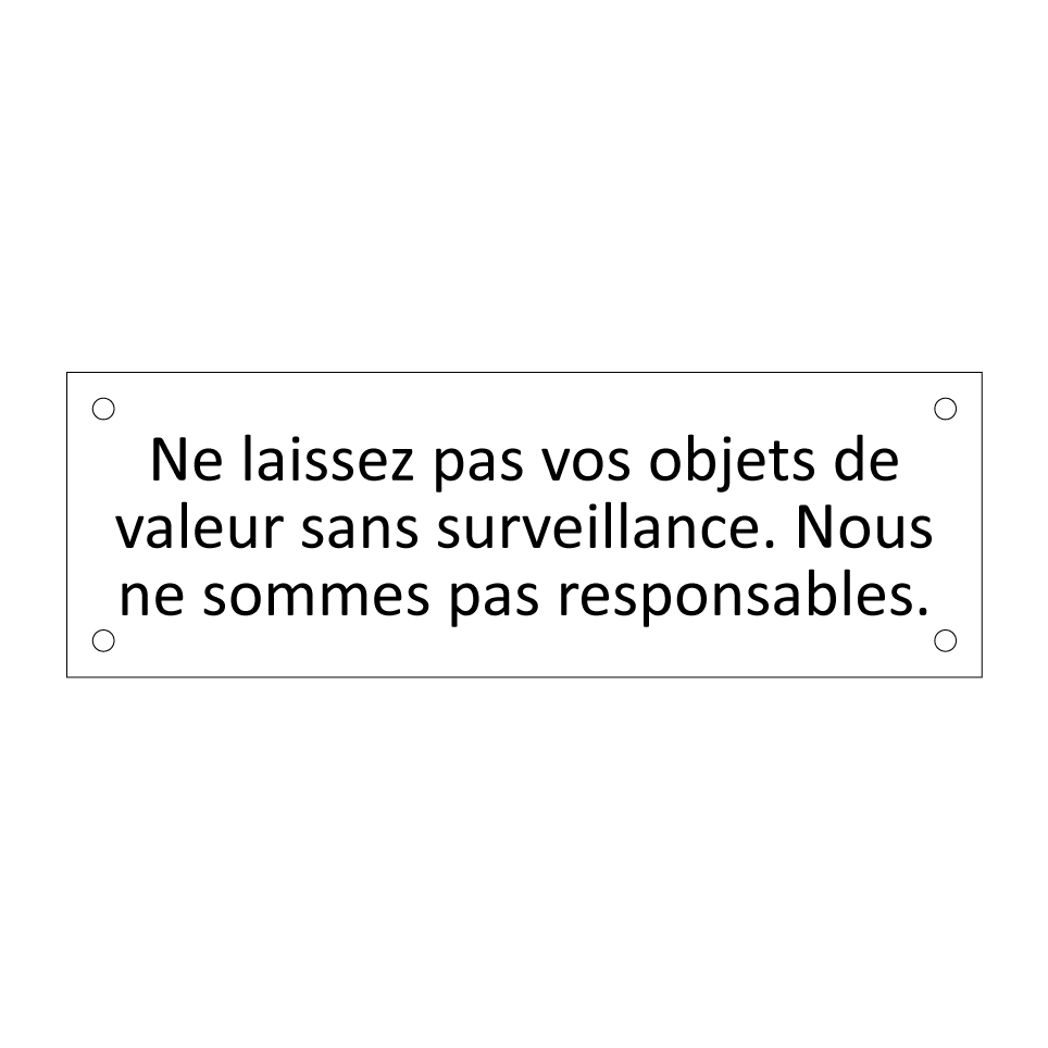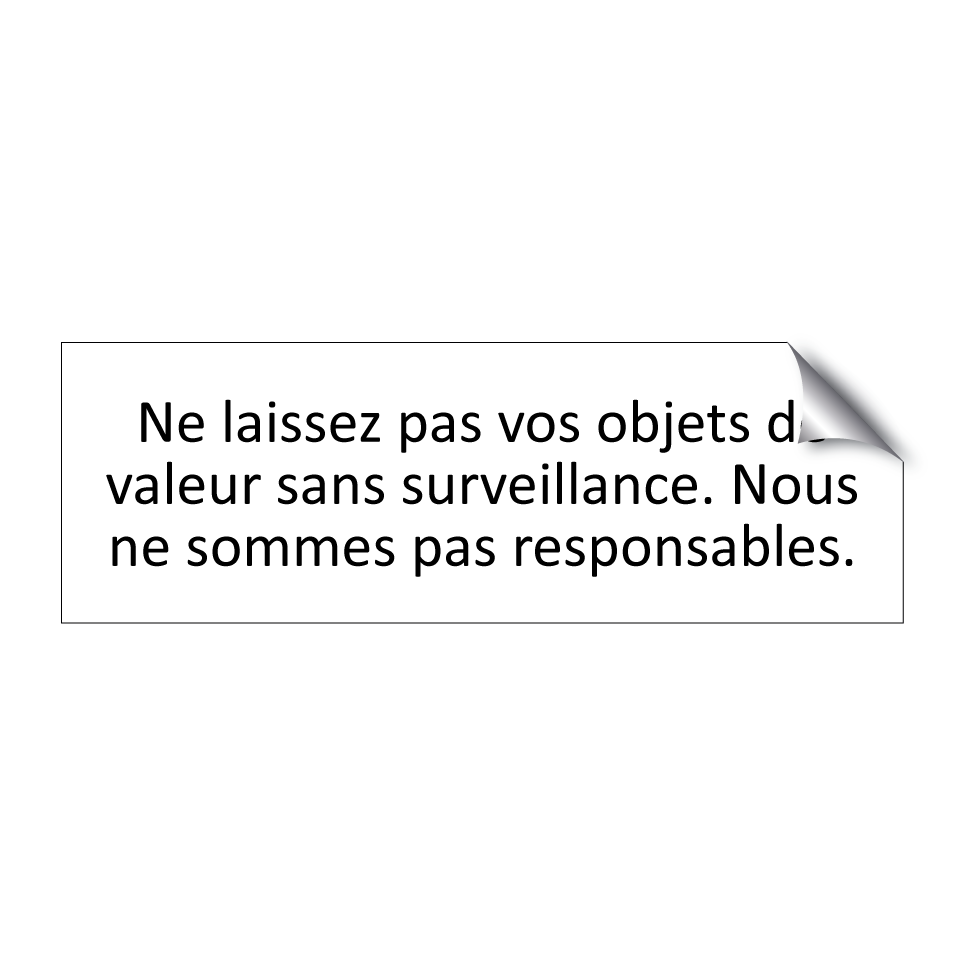 Panneau d'information avec le texte Ne laissez pas vos objets de valeur sans surveillance. Nous ne sommes pas responsables..