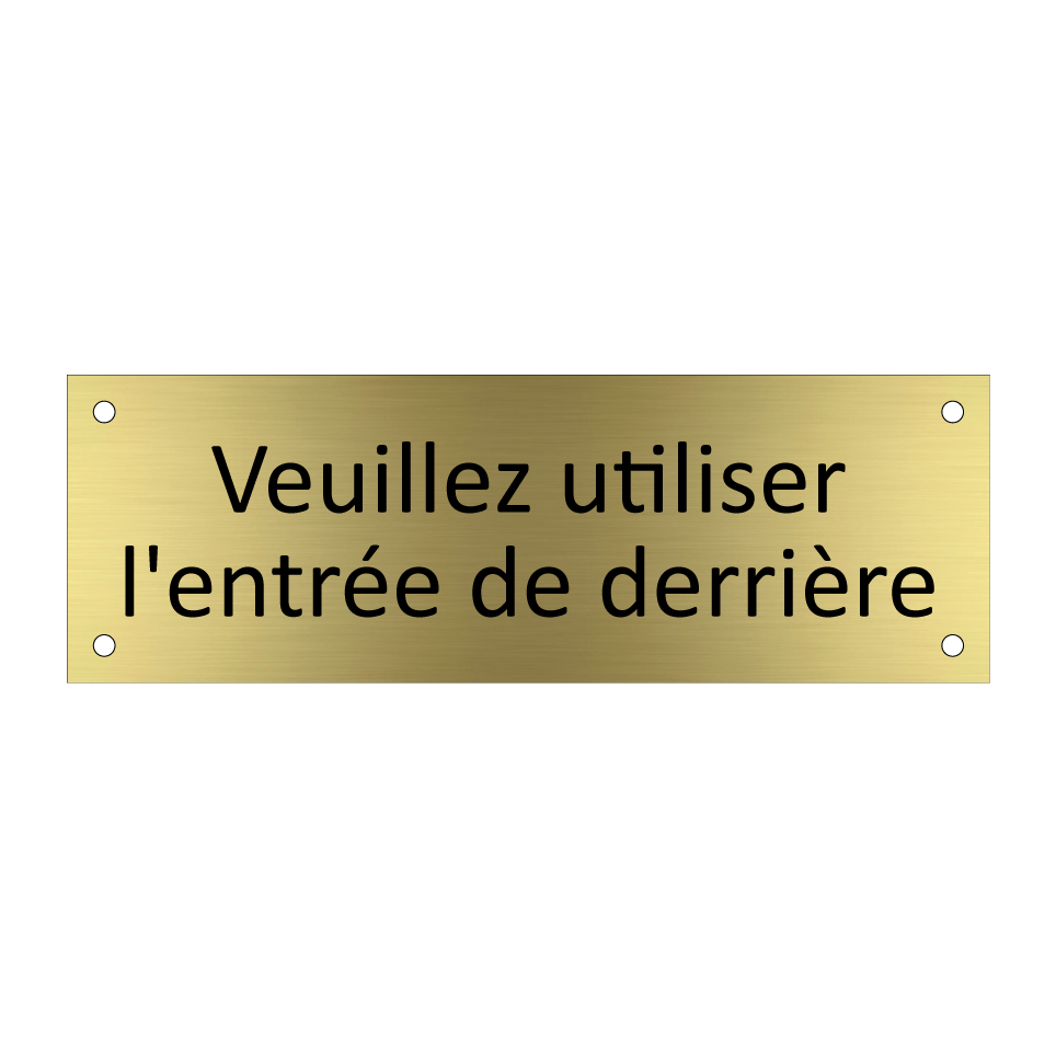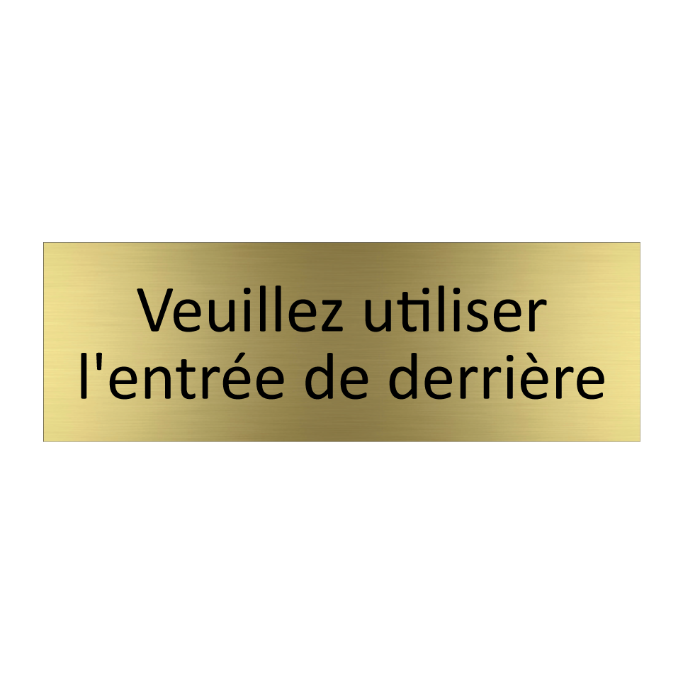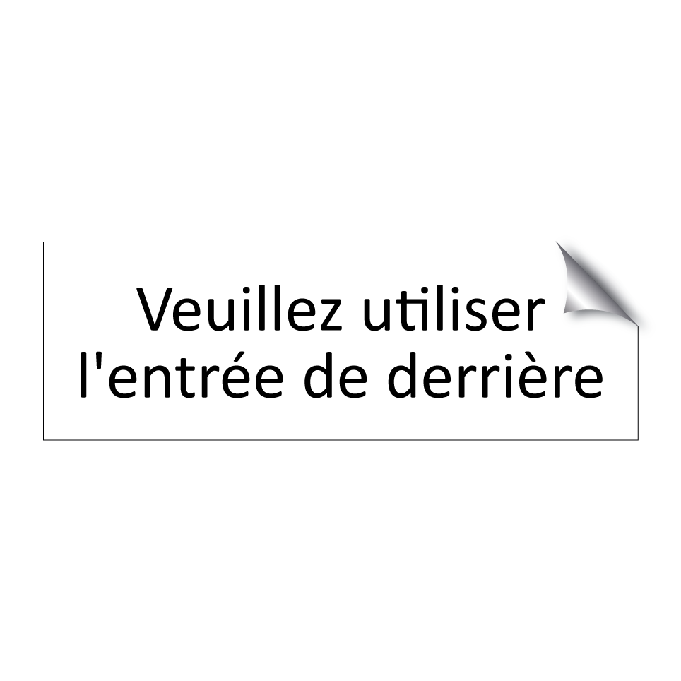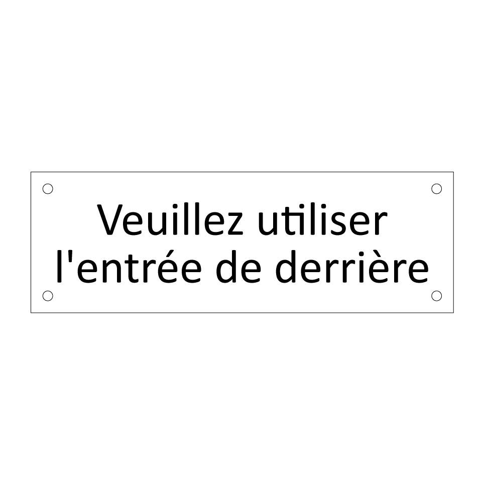 Panneau d'information avec le texte Veuillez utiliser l'entrée de derrière.